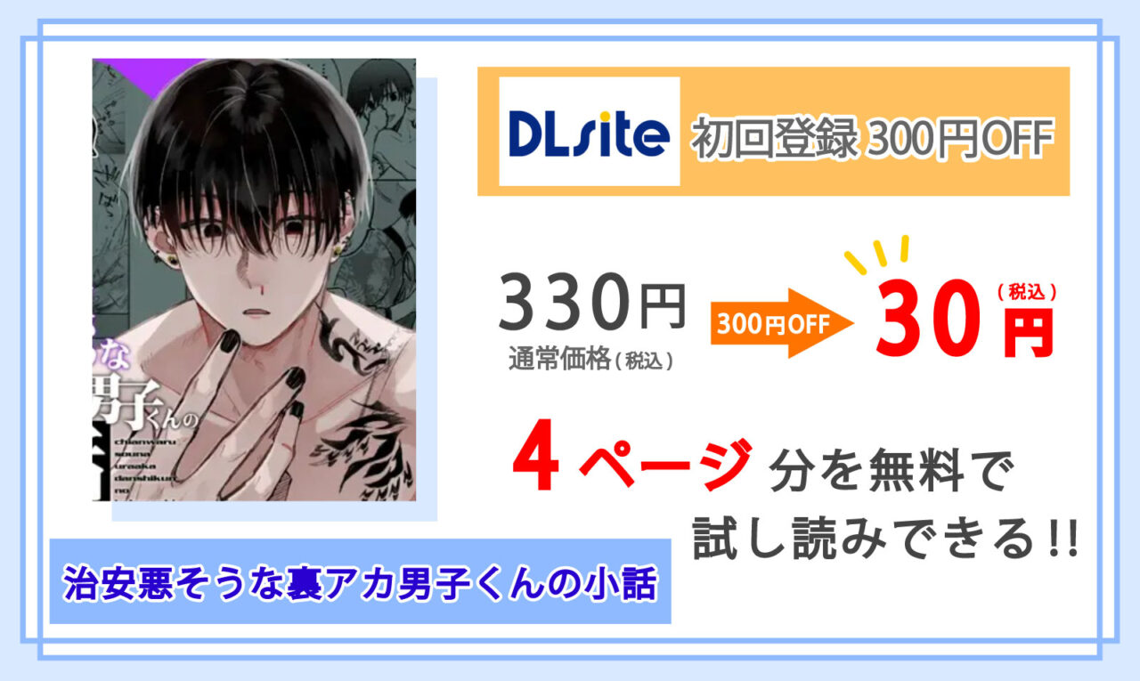DLsiteでなら新規登録時にもらう”300円OFFクーポン”を使うことで、マンガ『治安悪そうな裏アカ男子くんの小話』が非常にお得に購入できます!
