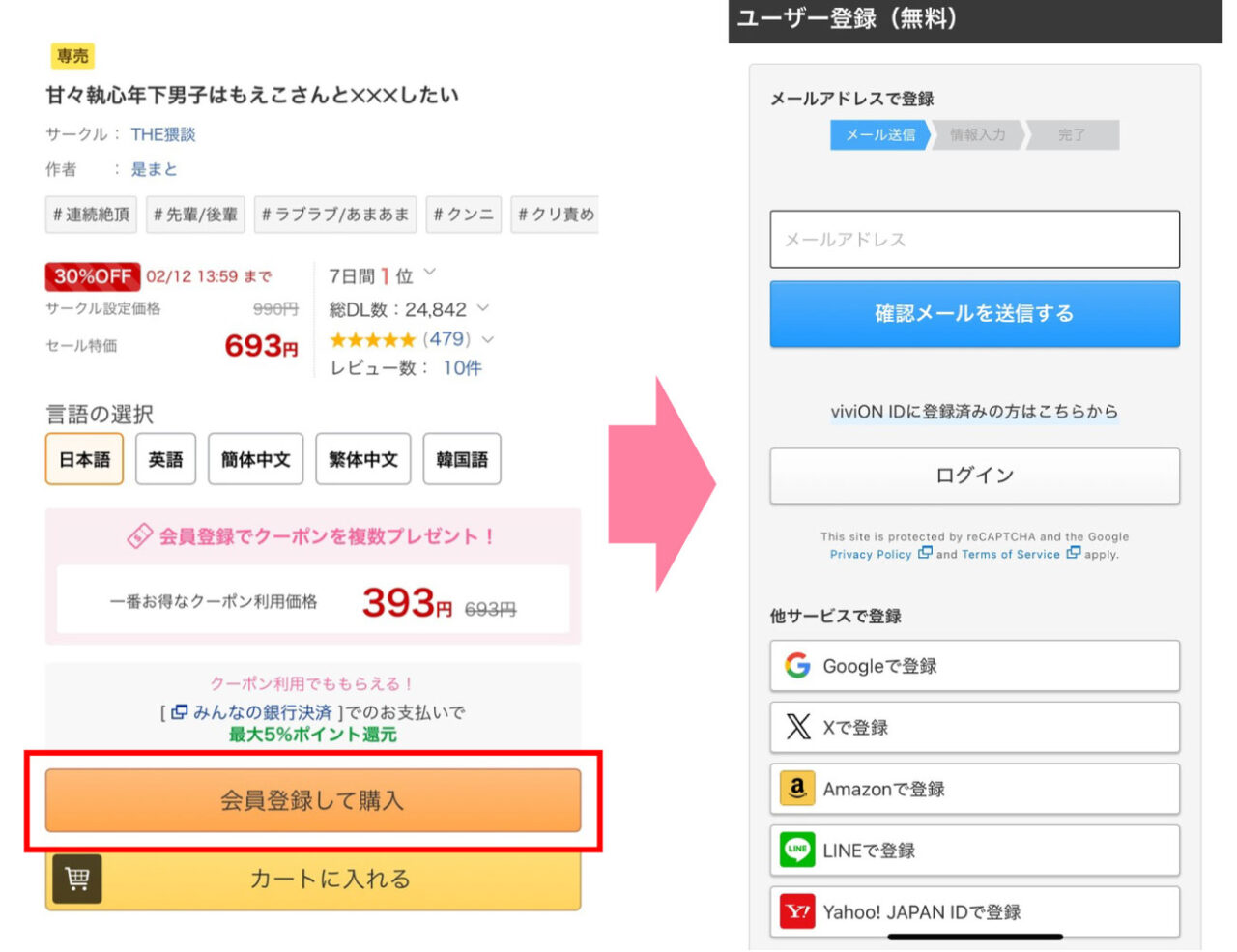本ページのリンクボタンを押して漫画『甘々執心年下男子はもえこさんと✕✕✕したい』購入ページにアクセスし、DLsiteに無料登録します。