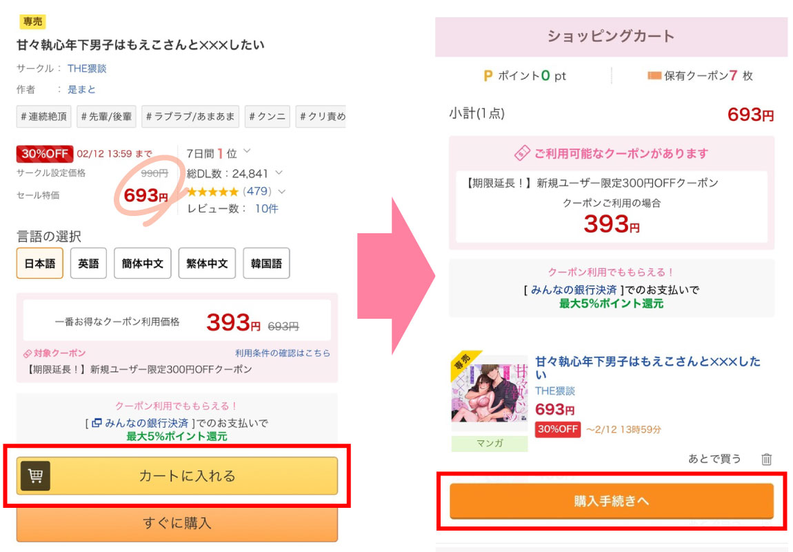漫画『甘々執心年下男子はもえこさんと✕✕✕したい』のように期間限定割引セール中の作品は、割引後の価格に対して300円OFFすることが出来ますので、非常にお得になります。