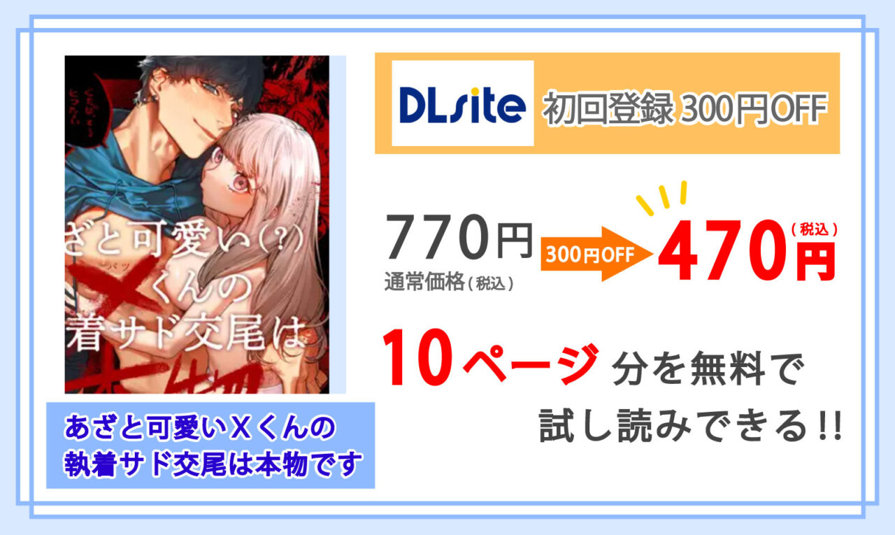 DLsiteでなら新規登録時にもらう”300円OFFクーポン”を使うことで、マンガ『あざと可愛い✕くんの執着サド交尾は本物です』が非常にお得に購入できます!
