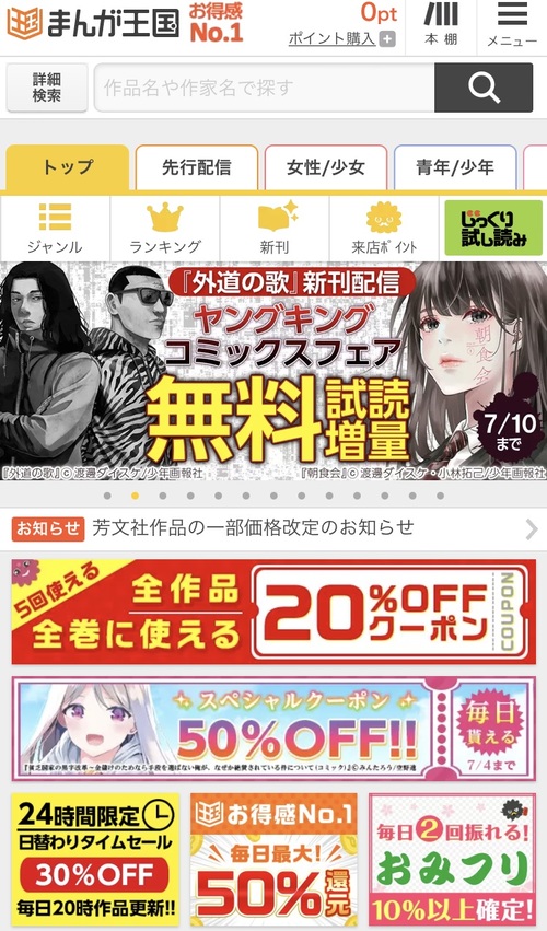 まんが王国の、特に人気なポイントが「ポイントの還元率がすごい」ことと「無料の試し読みがじっくりできる」ことの2点。