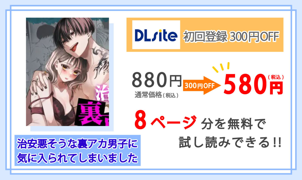 DLsiteでなら新規登録時にもらう”300円OFFクーポン”を使うことで、マンガ『治安悪そうな裏アカ男子に気に入られてしまいました』が非常にお得に購入できます!