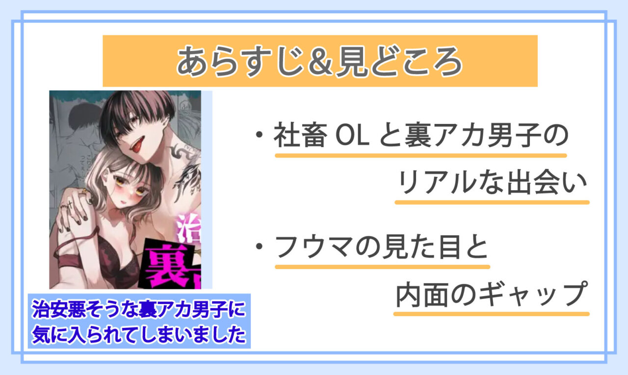 主人公は、過酷な労働環境に疲れ果てたOL。彼女がSNSで出会ったのは、全身にタトゥーを入れたミステリアスな裏アカ男子・フウマ。一見危険な香りのする彼との出会いが、彼女の人生を大きく変えていきます。現代社会の孤独やストレスを背景にしたリアルな設定が、読者にとってもよりこの作品の世界観に入りやすくしています。