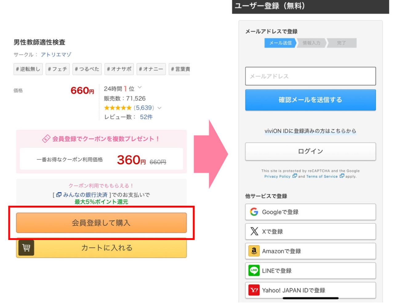 本ページのリンクボタンを押して漫画『男性教師適性検査』購入ページにアクセスし、DLsiteに無料登録します。