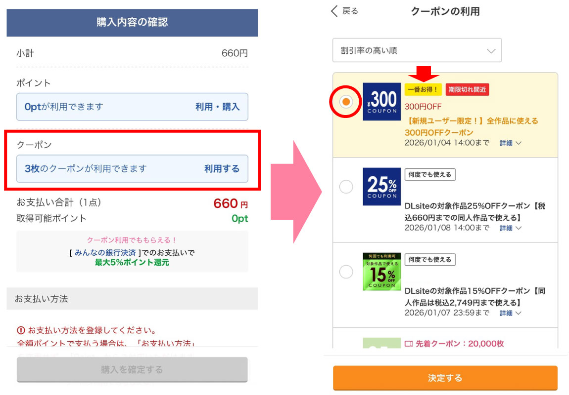 新規登録の時は【300円OFFクーポン】を利用するのが一番お得になりますので、それを選択します。