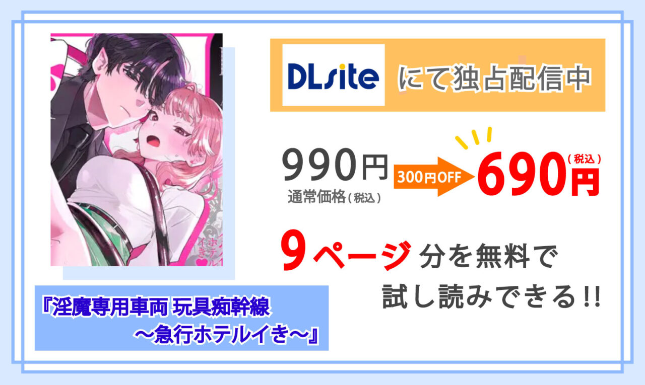 ちなみにマンガ『淫魔専用車両 玩具痴幹線 ~急行ホテルイき~』はDLsiteで、いまなら期間限定(2025/11/06まで)で15%OFF!!以下の価格で購入することができます。