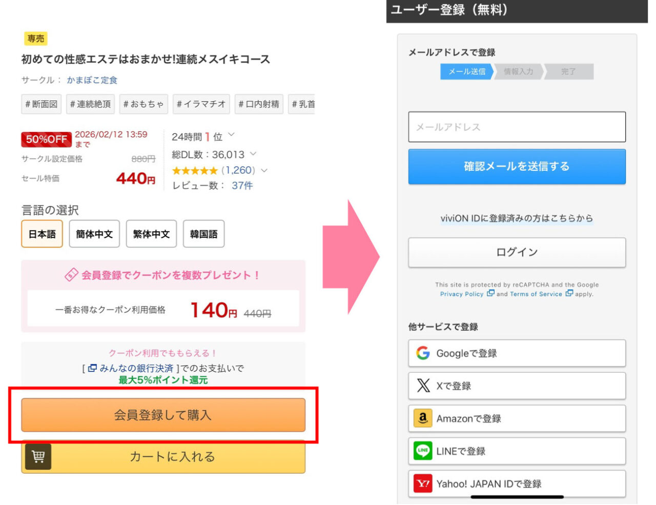 本ページのリンクボタンを押して漫画『初めての性感エステはおまかせ!連続メスイキコース』購入ページにアクセスし、DLsiteに無料登録します。
