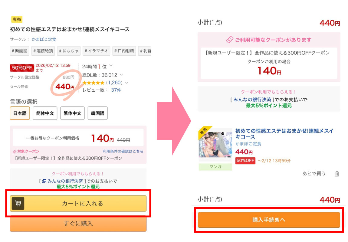 漫画『初めての性感エステはおまかせ!連続メスイキコース』のように期間限定割引セール中の作品は、割引後の価格に対して300円OFFすることが出来ますので、非常にお得になります。