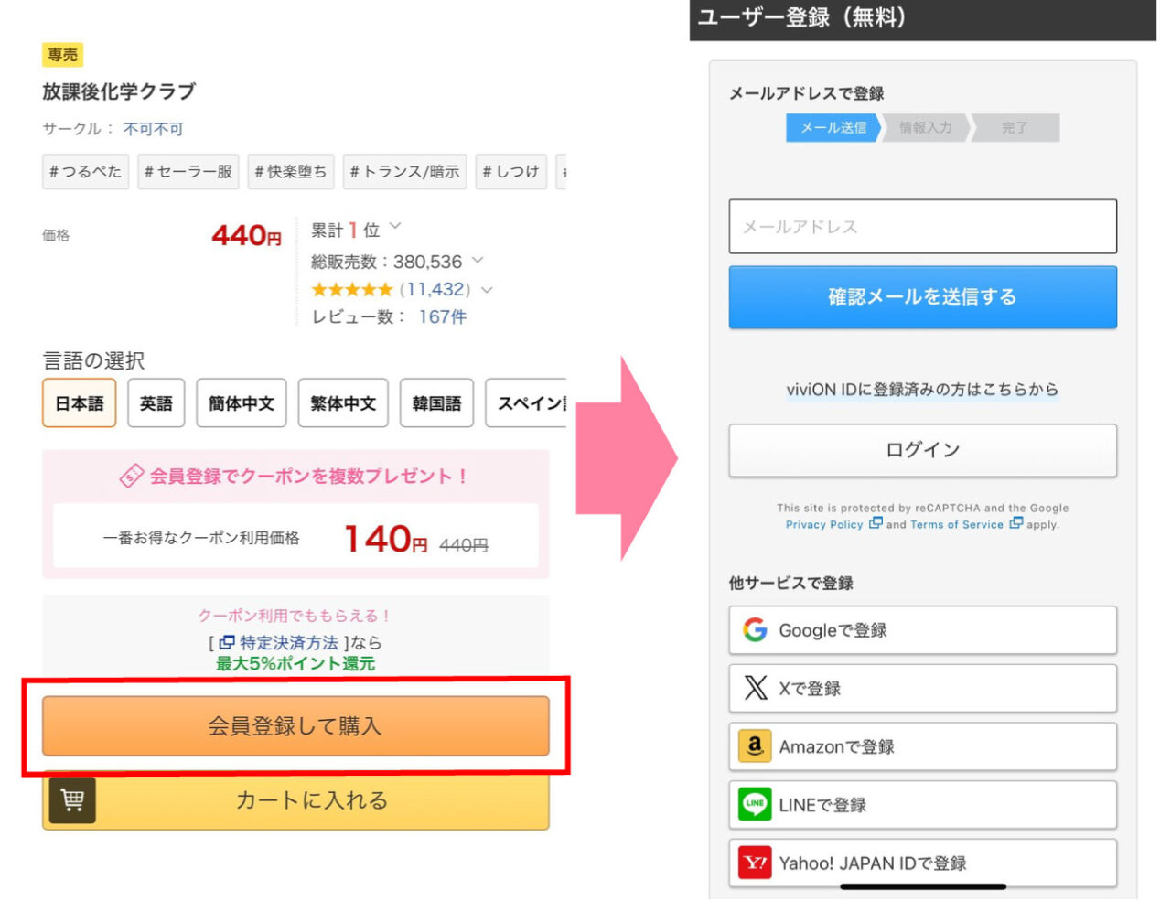 本ページのリンクボタンを押して漫画『放課後化学クラブ』購入ページにアクセスし、DLsite無料登録します。