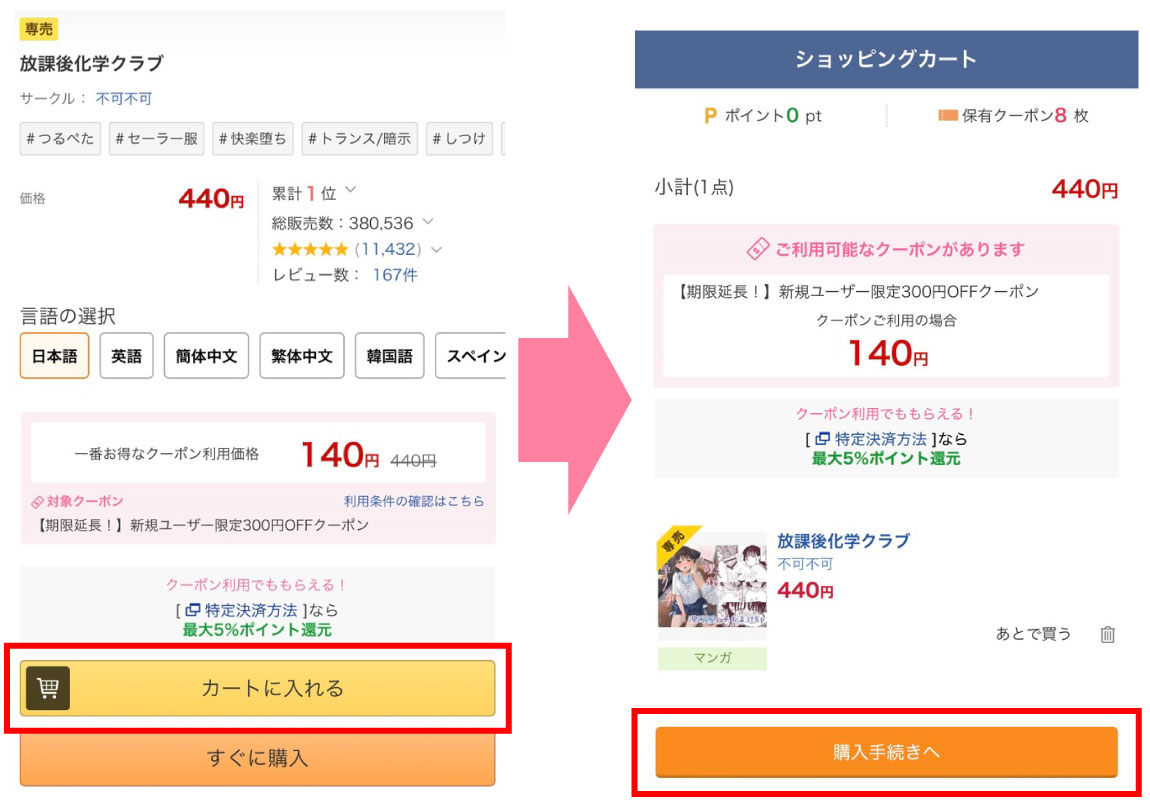 購入画面に移行すると、漫画『放課後化学クラブ』の購入に対して利用できるクーポンが表示されます。その一覧の中から、一番お得になるクーポンを選びます。