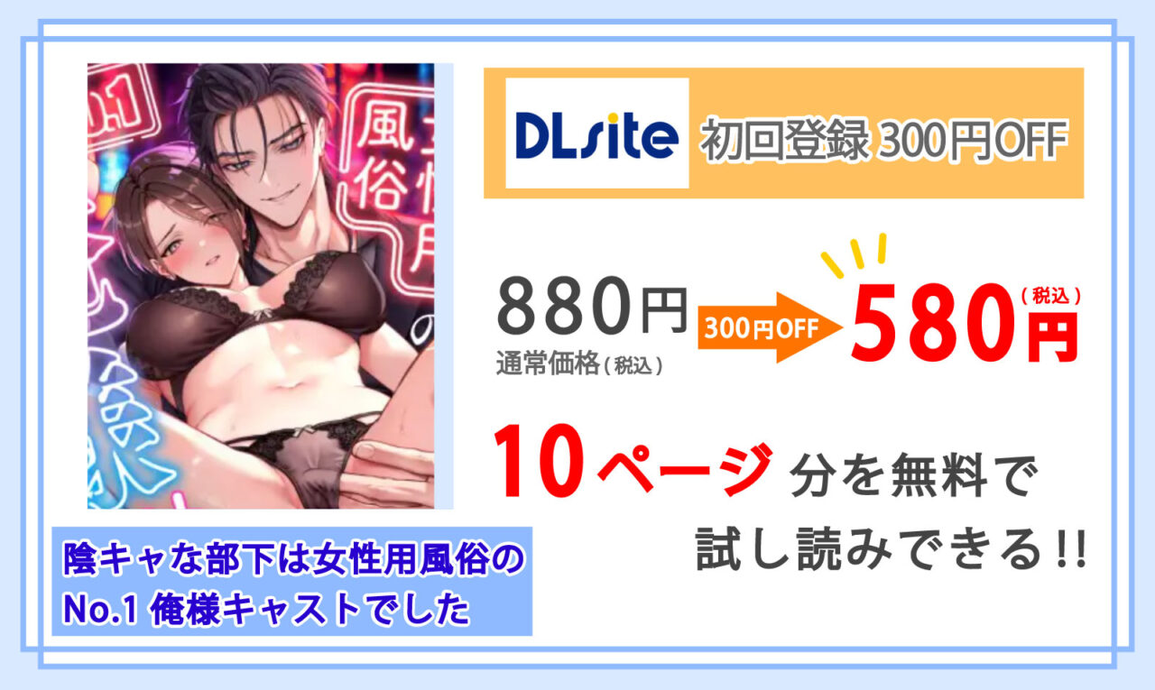 DLsiteでなら新規登録時にもらう”300円OFFクーポン”を使うことで、マンガ『陰キャな部下は女性用風俗のNo.1俺様キャストでした』が非常にお得に購入できます!