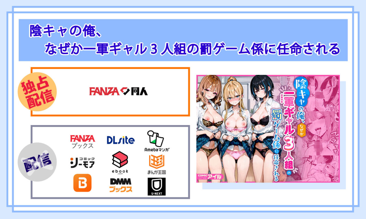 比較してみた結果、マンガ『陰キャの俺、なぜか一軍ギャル3人組の罰ゲーム係に任命される』は、「成人向けの商品が非常に充実したアダルト専門サイト」であるFANZA同人でしか配信されていないことが分かりました♪