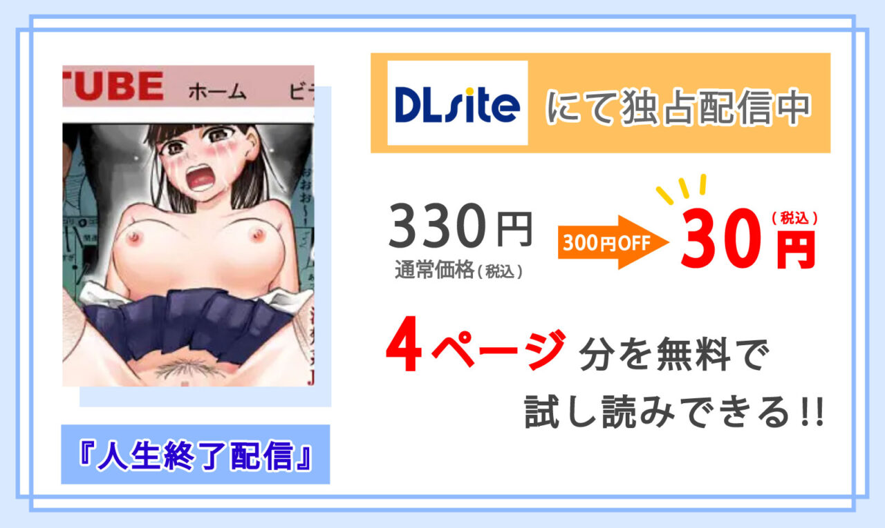 管理人結論から言いますと、マンガ『人生終了配信』を合法的に無料で読む方法は無く、ただいまDLsiteでしか配信されていません。