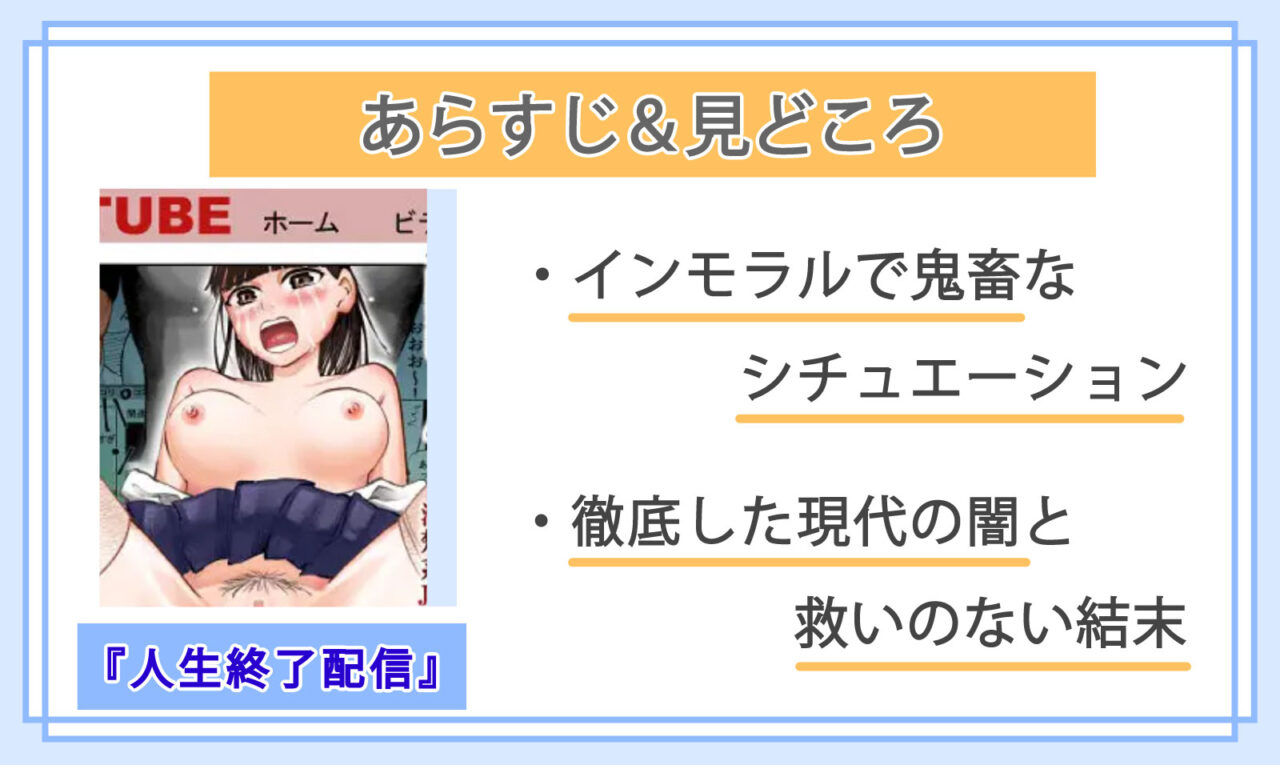 ごく普通の清楚系女子高生が、見知らぬ男たちに凌辱され全世界に配信されてしまう、鬼畜系成年同人漫画『人生終了配信 ~住所や学校から恥ずかしい部分までぜんぶ晒されちゃう清楚系JK~』。