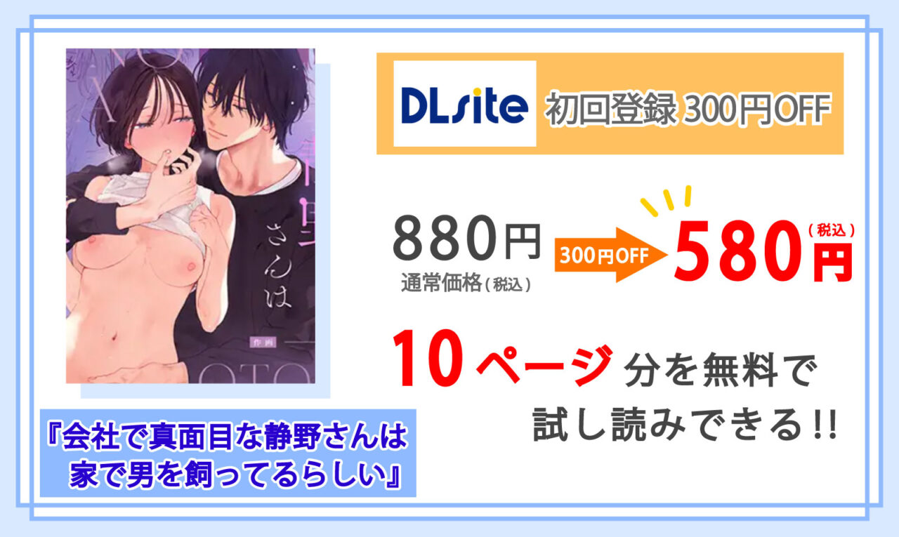 DLsiteでなら新規登録時にもらう”300円OFFクーポン”を使うことで、マンガ『会社で真面目な静野さんは家で男を飼ってるらしい』が非常にお得に購入できます!