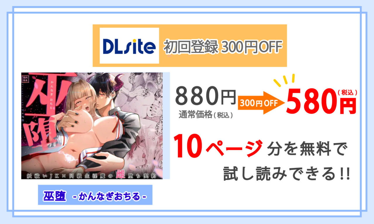 DLsiteでなら新規登録時にもらう300円OFFクーポン”を使うことで、マンガ『巫堕 ─妖祓いJK×同級生淫魔の雌堕ち契約─』が非常にお得に購入できます!