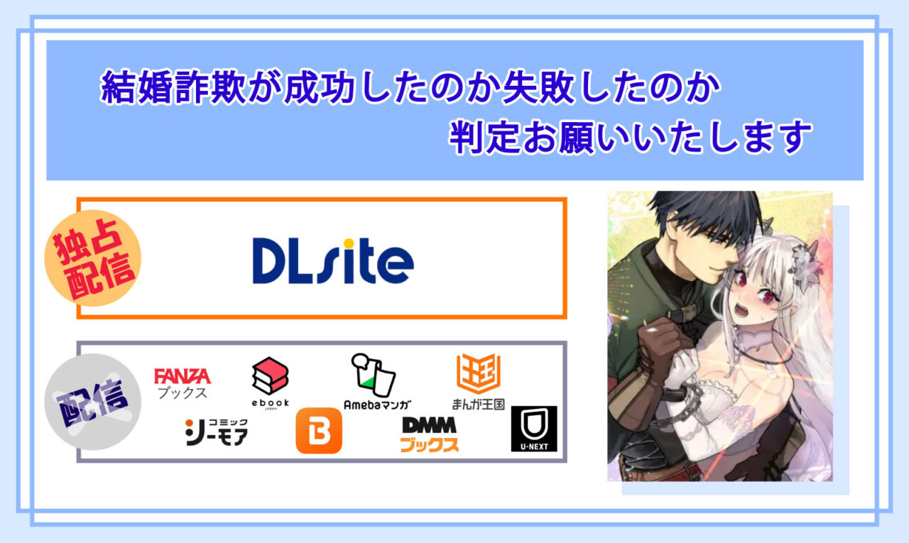 比較してみた結果、マンガ『結婚詐欺が成功したのか失敗したのか判定お願いいたします』の電子書籍は、「国内最大級の二次元総合ダウンロードショップ」であるDLsiteでしか配信されていないことが分かりました♪