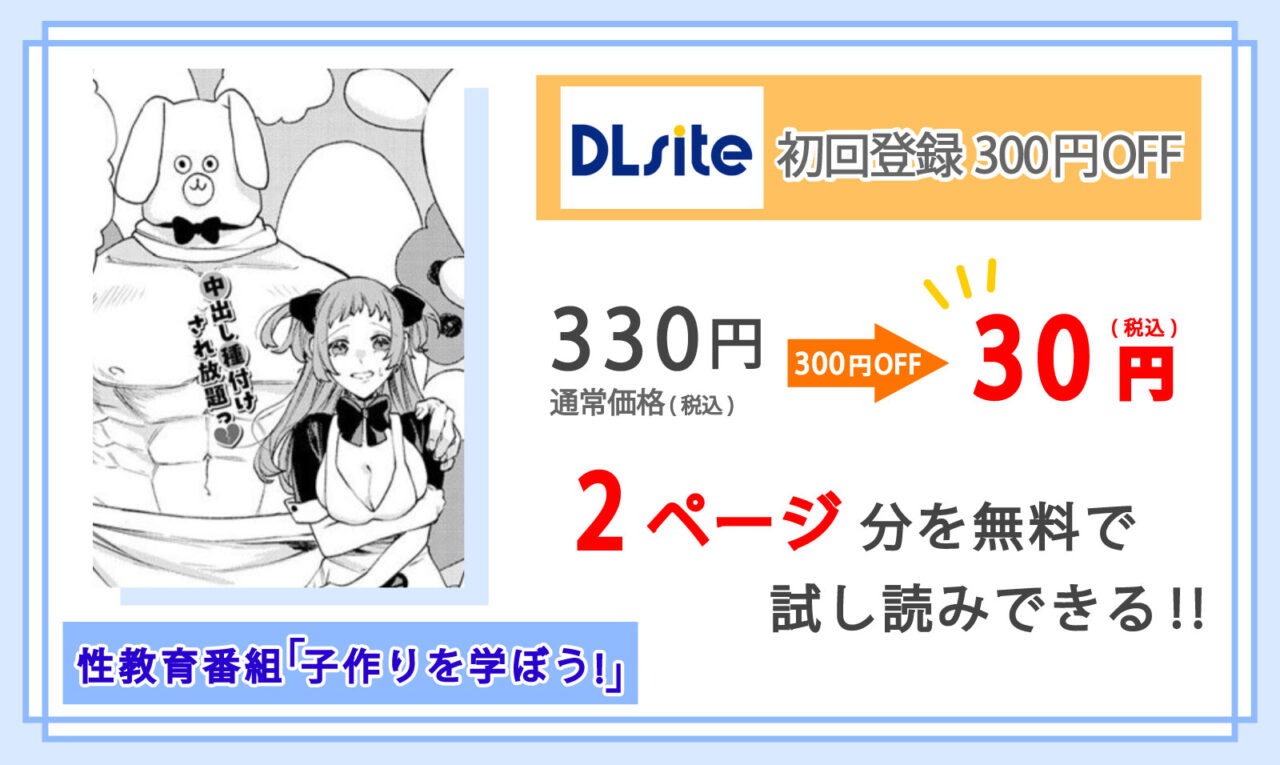 DLsiteでなら新規登録時にもらう”300円OFFクーポン”を使うことで、マンガ『性教育番組「子作りを学ぼう!」』が非常にお得に購入できます!