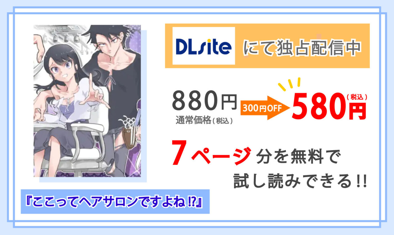 ちなみにマンガ『ここってヘアサロンですよね!?』はDLsiteで、いまなら期間限定(2025/11/20まで)で50%OFF!!以下の価格で購入することができます。