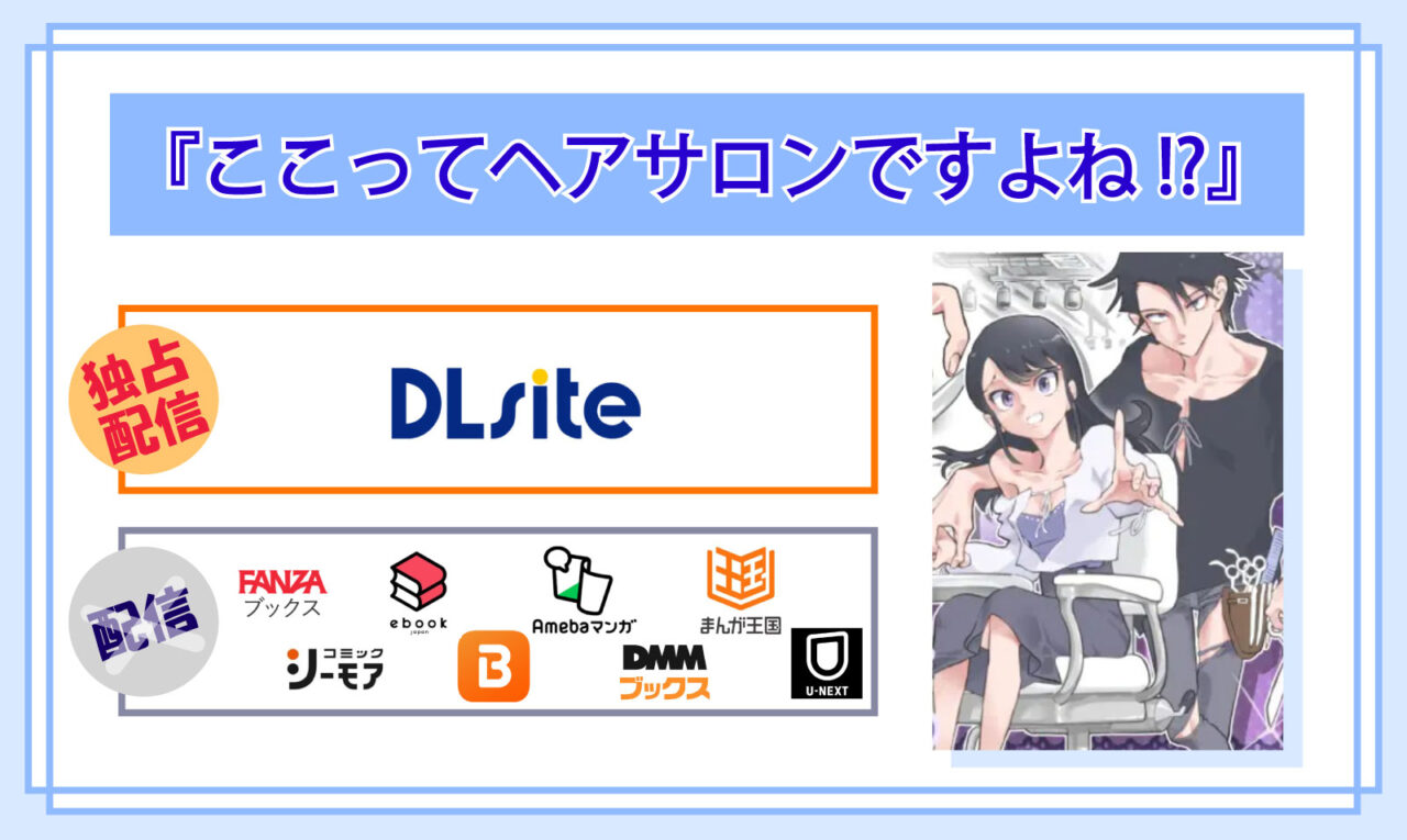 比較してみた結果、マンガ『ここってヘアサロンですよね!?』は、「国内最大級の二次元総合ダウンロードショップ」であるDLsiteでしか配信されていないことが分かりました♪
