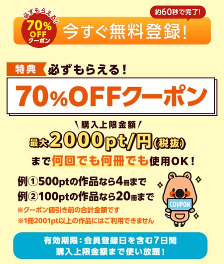 - 1冊70%OFFクーポン(無料会員登録)が必ずもらえる!