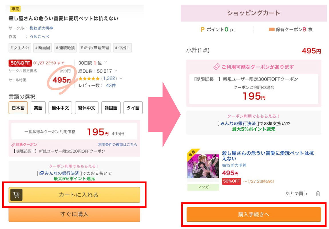 漫画『殺し屋さんの危うい盲愛に愛玩ペットは抗えない』のように期間限定割引セール中の作品は、割引後の価格に対して300円OFFすることが出来ますので、非常にお得になります。