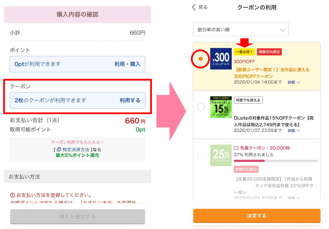 1. DLsiteに無料登録して【300円OFFクーポン】ゲット