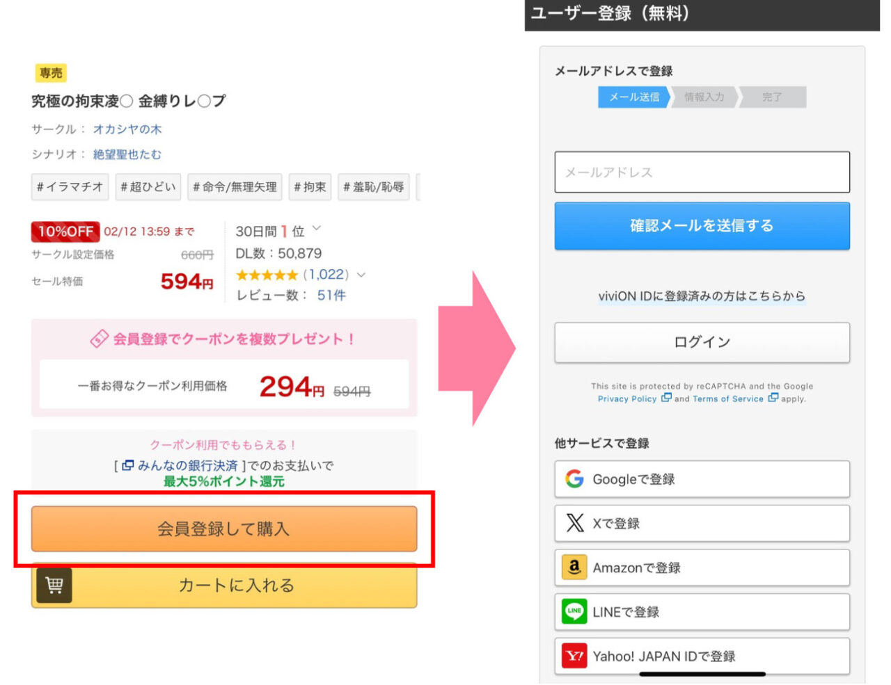 本ページのリンクボタンを押して漫画『究極の拘束凌○ 金縛りレ○プ』購入ページにアクセスし、DLsiteに無料登録します。