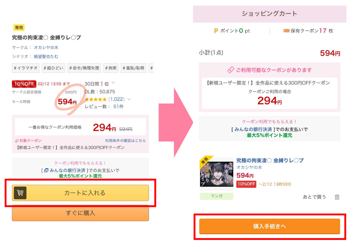 漫画『究極の拘束凌○ 金縛りレ○プ』のように期間限定割引セール中の作品は、割引後の価格に対して300円OFFすることが出来ますので、非常にお得になります。