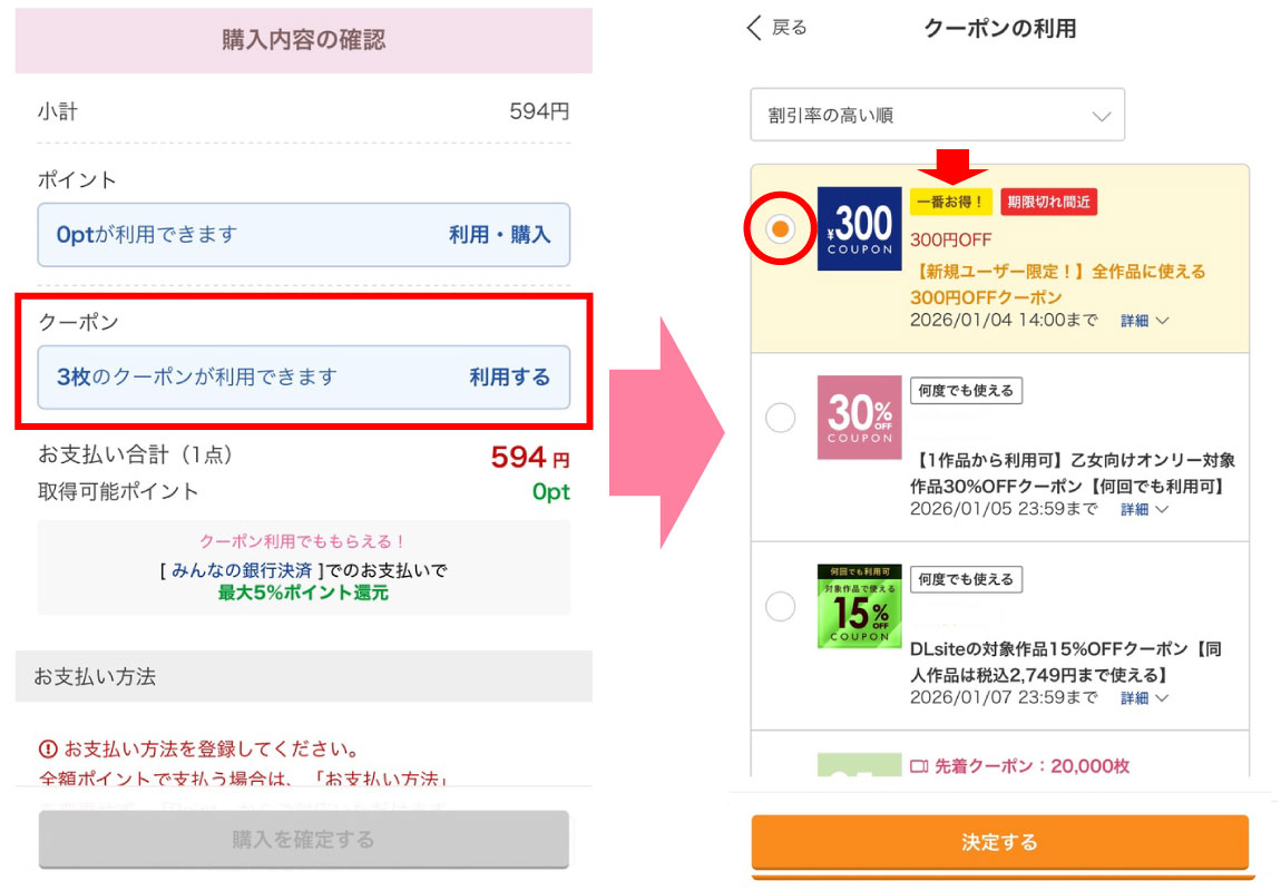 新規登録の時は【300円OFFクーポン】を利用するのが一番お得になりますので、それを選択します。