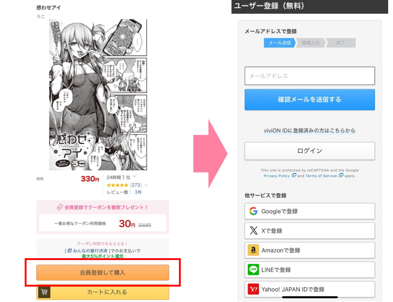 本ページのリンクボタンを押して漫画『惑わせアイ』購入ページにアクセスし、DLsite無料登録します。
