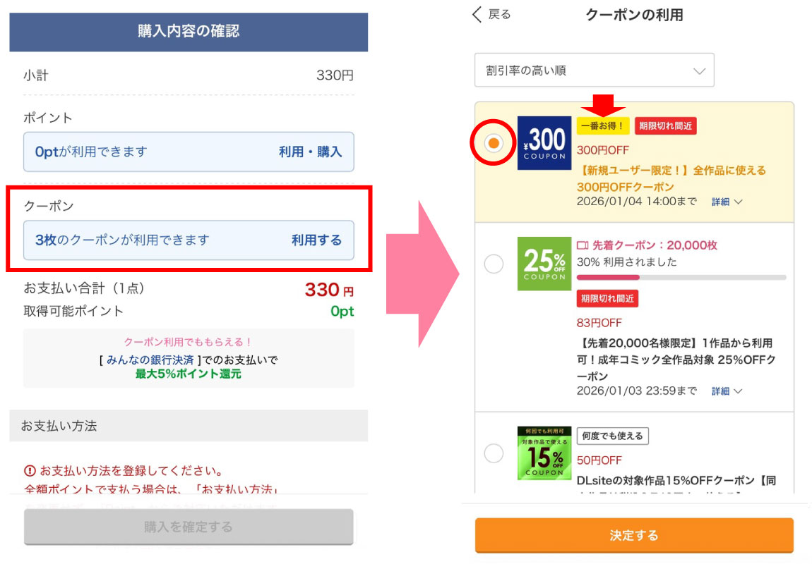 新規登録の時は【300円OFFクーポン】を利用するのが一番お得になりますので、それを選択します。