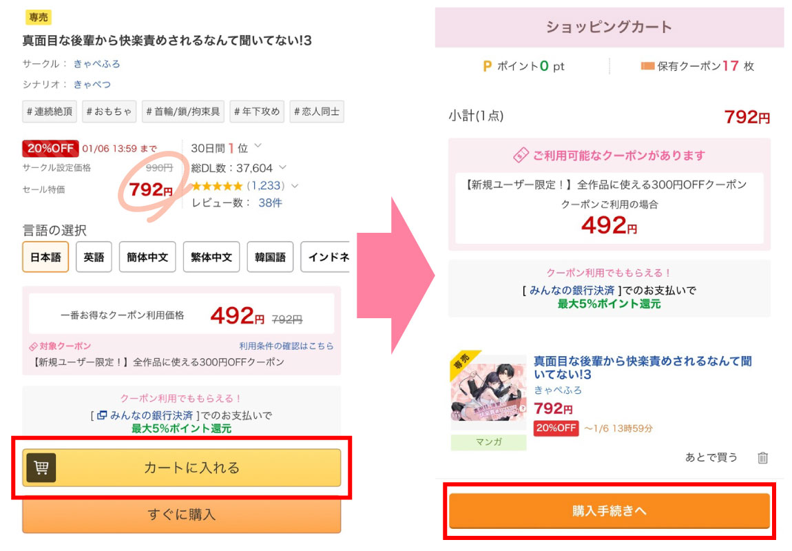 漫画『真面目な後輩から快楽責めされるなんて聞いてない!3』のように期間限定割引セール中の作品は、割引後の価格に対して300円OFFすることが出来ますので、非常にお得になります。