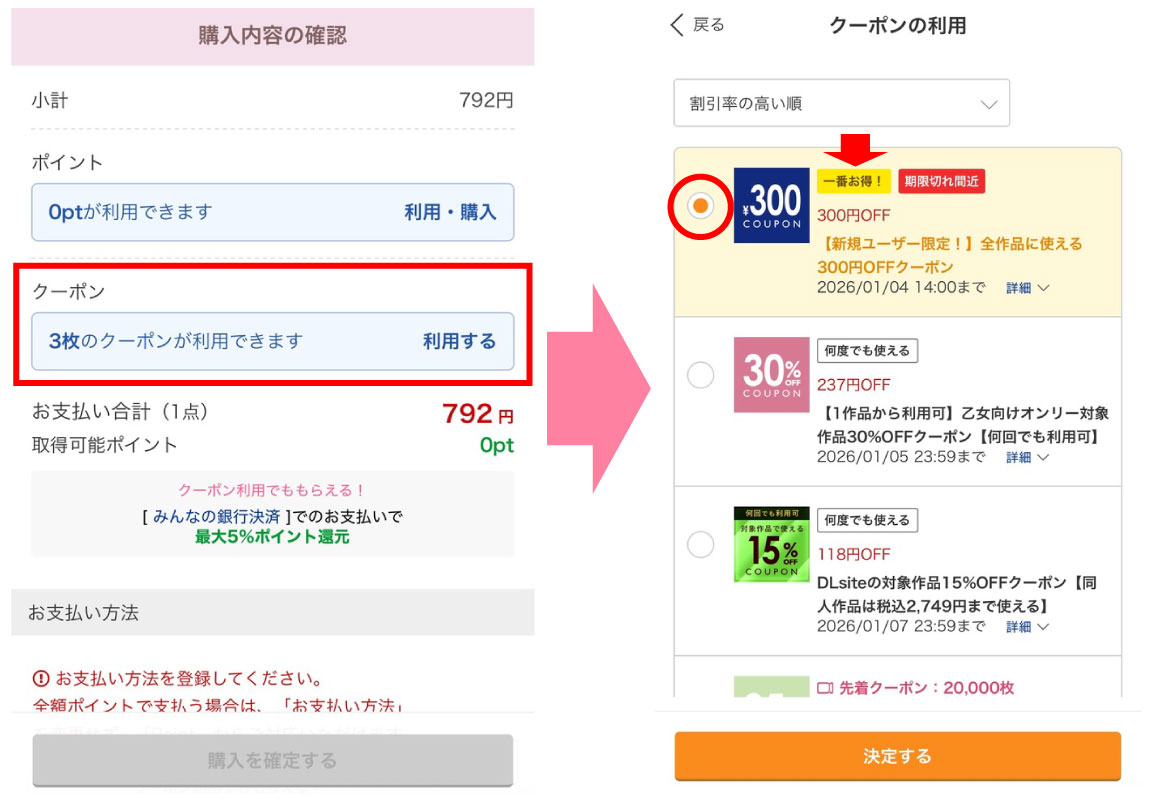 新規登録の時は【300円OFFクーポン】を利用するのが一番お得になりますので、それを選択します。