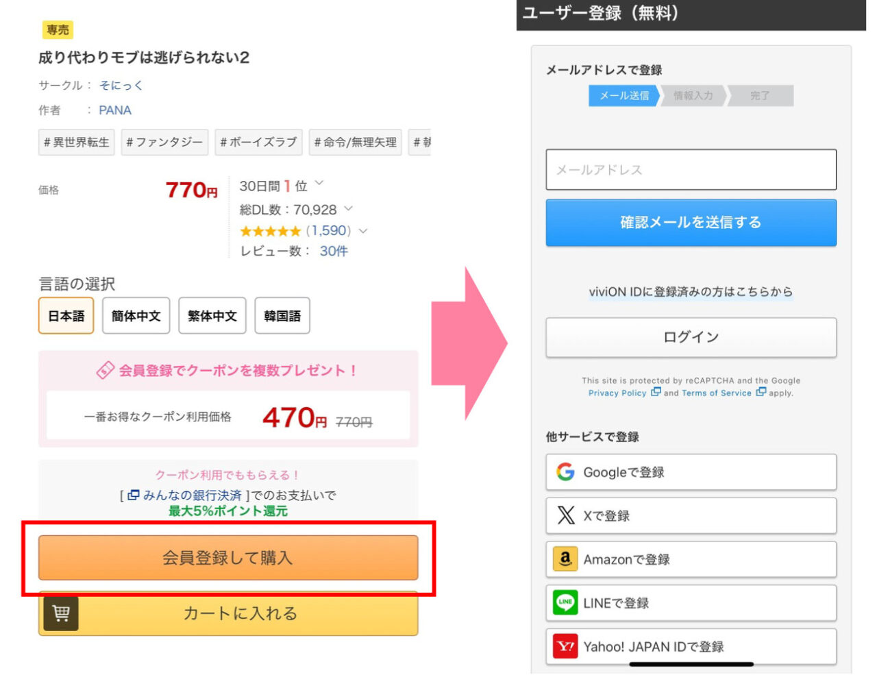 本ページのリンクボタンを押して漫画『成り代わりモブは逃げられない2』購入ページにアクセスし、DLsite無料登録します。