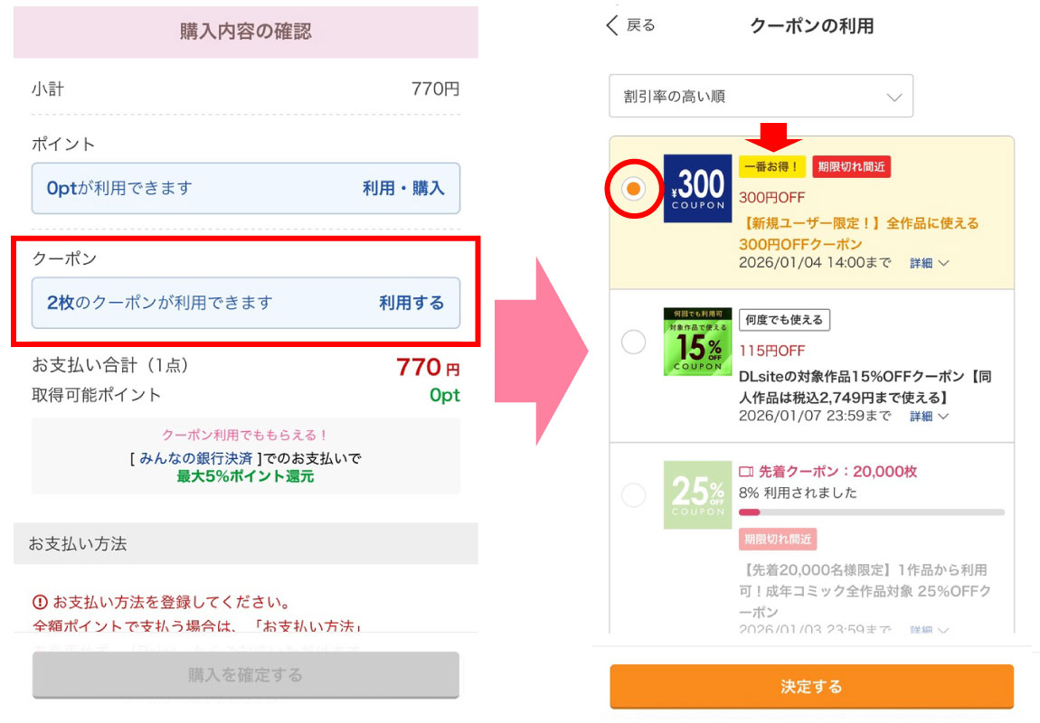 新規登録の時は【300円OFFクーポン】を利用するのが一番お得になりますので、それを選択します。
