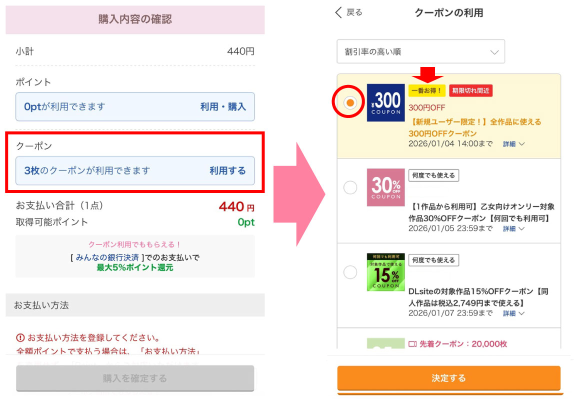 1. DLsiteに無料登録して【300円OFFクーポン】ゲット