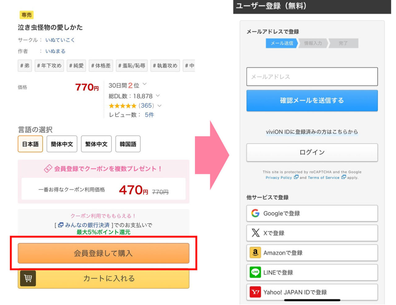 本ページのリンクボタンを押して漫画『泣き虫怪物の愛しかた』購入ページにアクセスし、DLsiteに無料登録します。