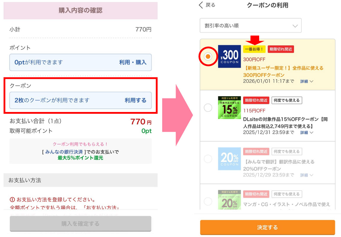 新規登録の時は【300円OFFクーポン】を利用するのが一番お得になりますので、それを選択します。