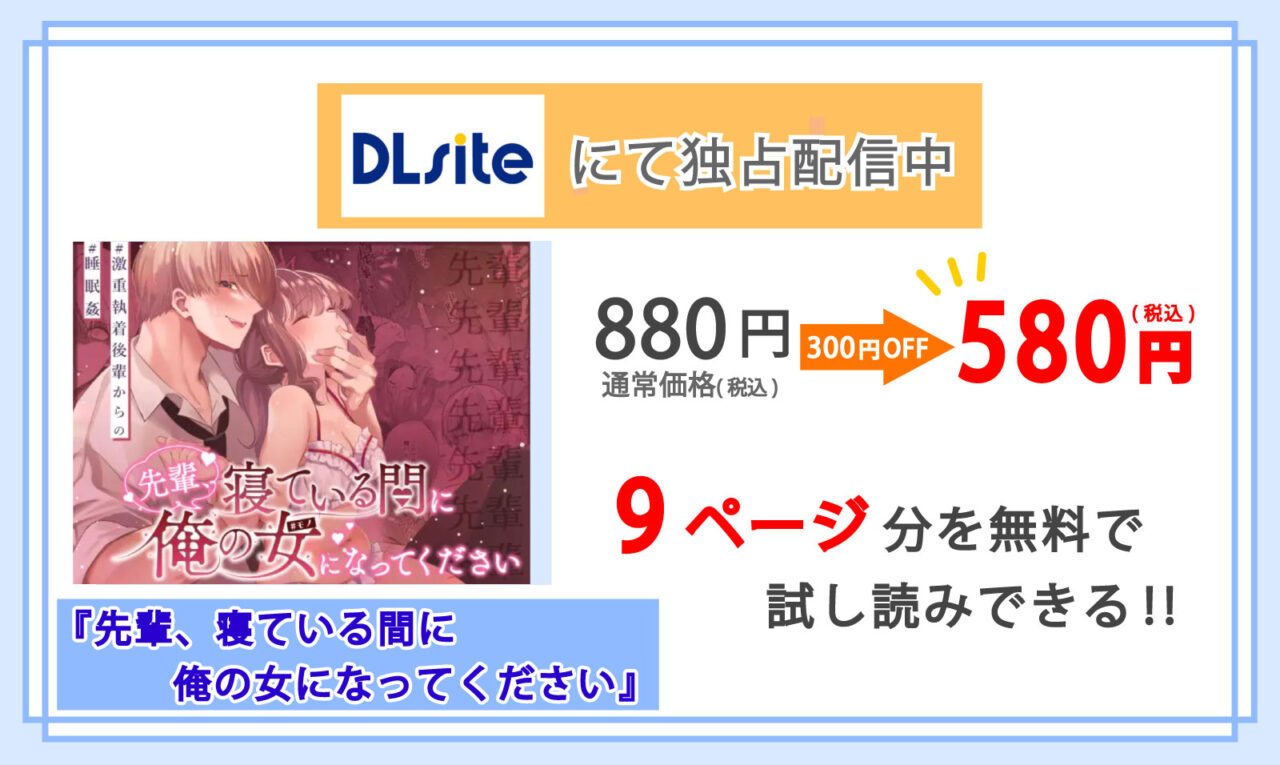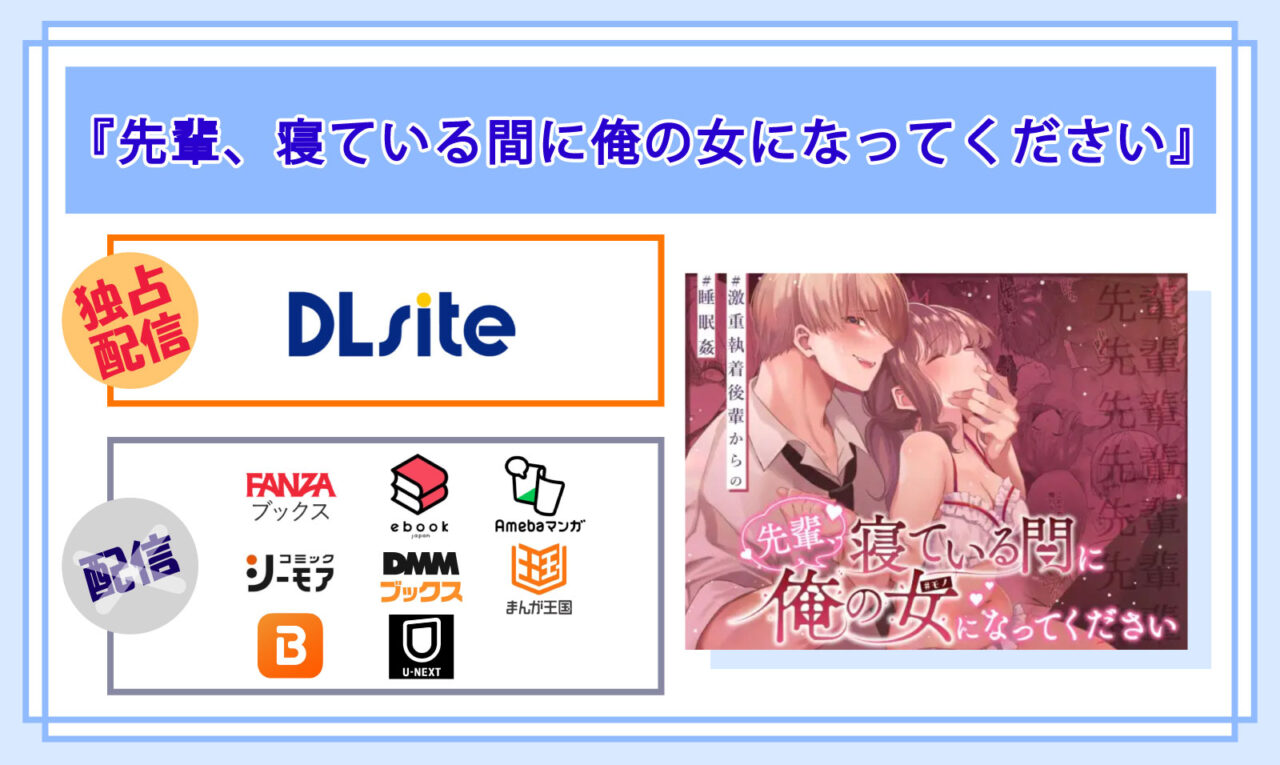 比較してみた結果、マンガ『先輩、寝ている間に俺の女になってください』は、「国内最大級の二次元総合ダウンロードショップ」であるDLsiteでしか配信されていないことが分かりました♪