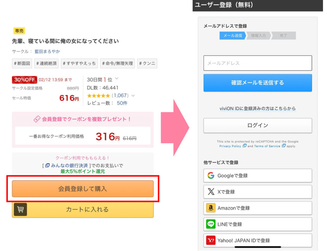 本ページのリンクボタンを押して漫画『先輩、寝ている間に俺の女になってください』購入ページにアクセスし、DLsite無料登録します。