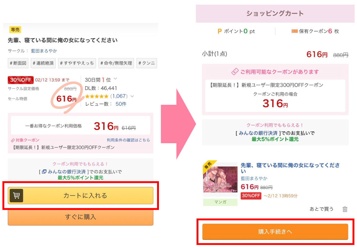 漫画『先輩、寝ている間に俺の女になってください』のように期間限定割引セール中の作品は、割引後の価格に対して300円OFFすることが出来ますので、非常にお得になります。