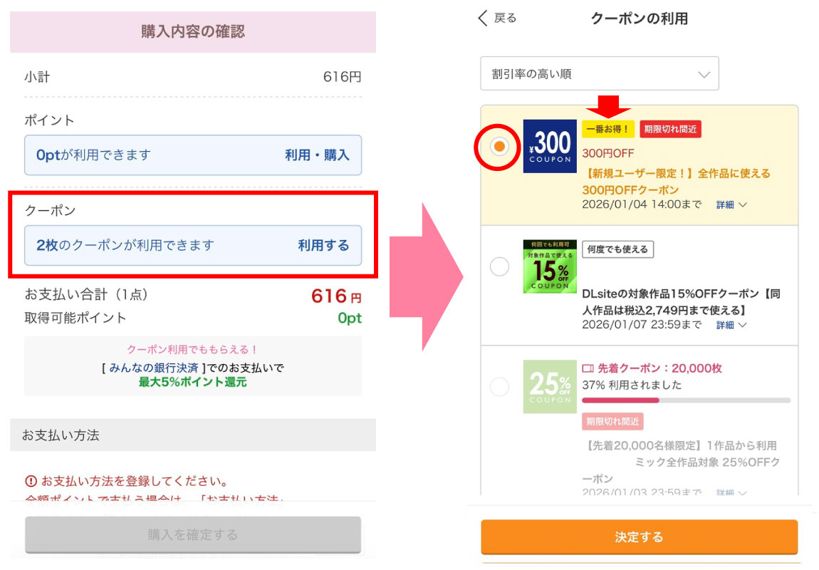 1. DLsiteに無料登録して【300円OFFクーポン】ゲット
