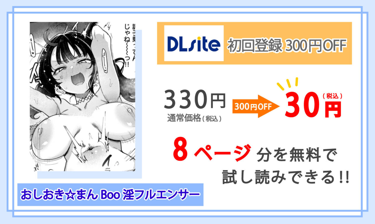DLsiteでなら新規登録時にもらう300円OFFクーポン”を使うことで、マンガ『おしおき☆まんBoo淫フルエンサー』が非常にお得に購入できます!