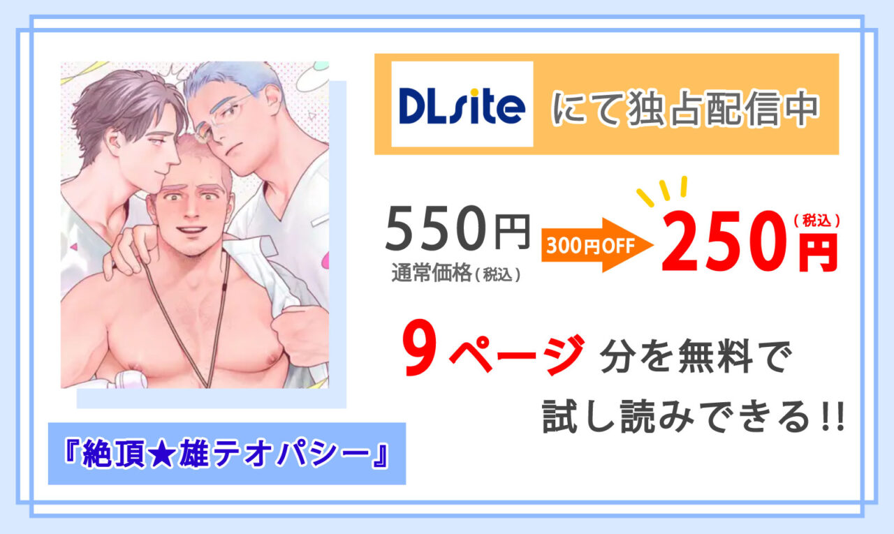 ちなみにマンガ『絶頂★雄テオパシー』はDLsiteで、いまなら期間限定(2026/02/12まで)で50%OFF!!以下の価格で購入することができます。