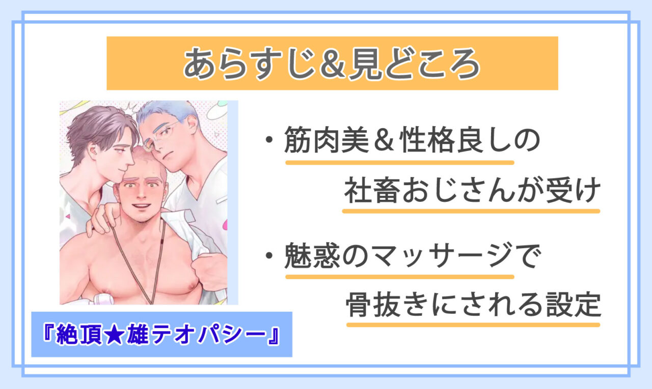疲れたおじさんが魅惑のマッサージにトロトロにほぐされる、”おじ受け”BL漫画『絶頂★雄テオパシー』。配信サイトにて人気を集めているBL漫画です。