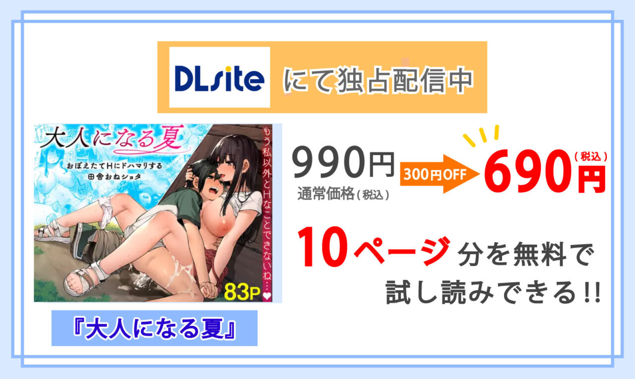 ちなみにマンガ『大人になる夏 -おぼえたてHにドハマりする田舎おねショタ-』はDLsiteで、いまなら期間限定(2026/02/12まで)で50%OFF!!以下の価格で購入することができます。