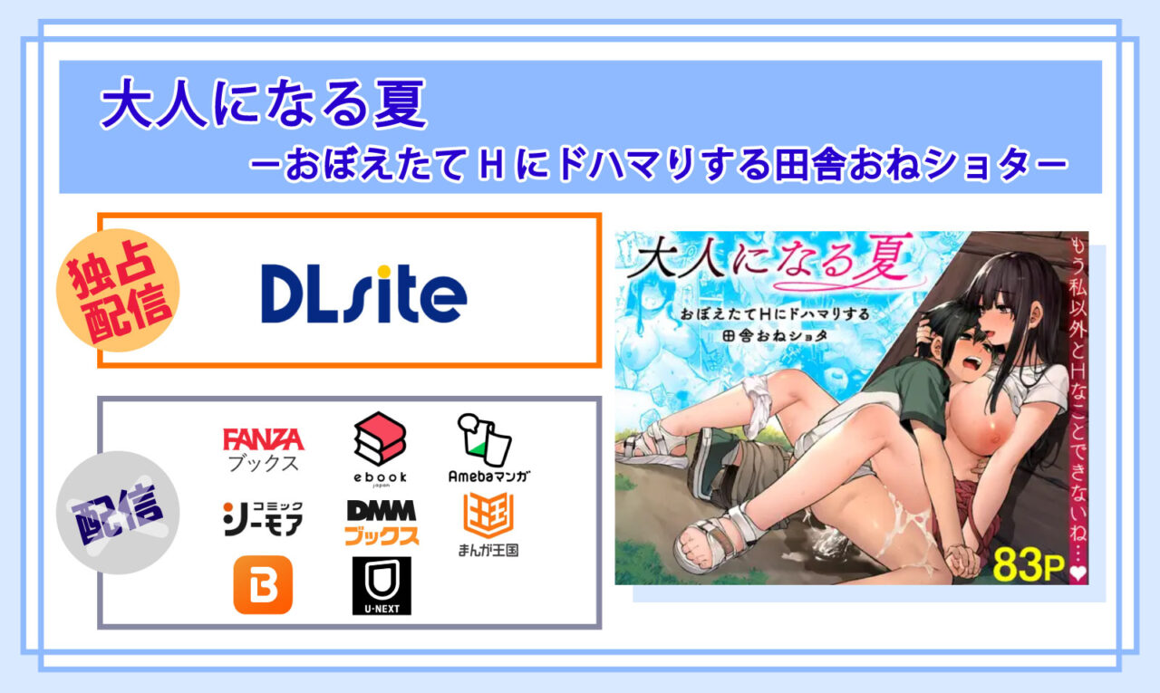 管理人結論から言いますと、マンガ『大人になる夏 -おぼえたてHにドハマりする田舎おねショタ-』はただいま、DLsiteでしか配信されていません。