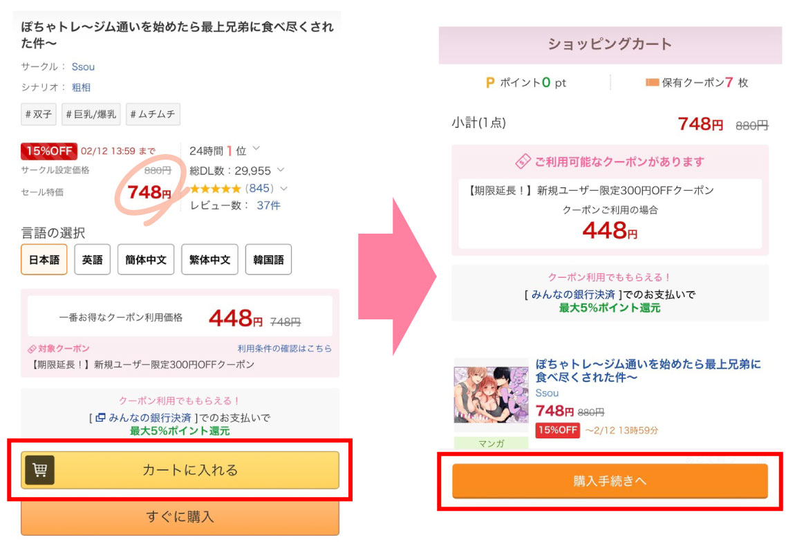 DLsiteでなら新規登録時にもらう”300円OFFクーポン”を使うことで、マンガ『ぽちゃトレ』が非常にお得に購入できます!