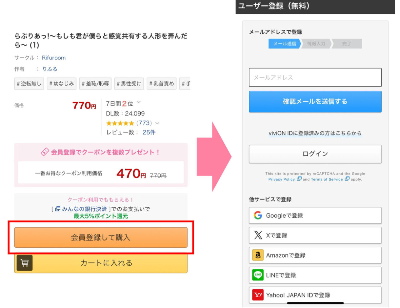 本ページのリンクボタンを押して漫画『らぶりあっ!~もしも君が僕らと感覚共有する人形を弄んだら~』購入ページにアクセスし、DLsiteに無料登録します。